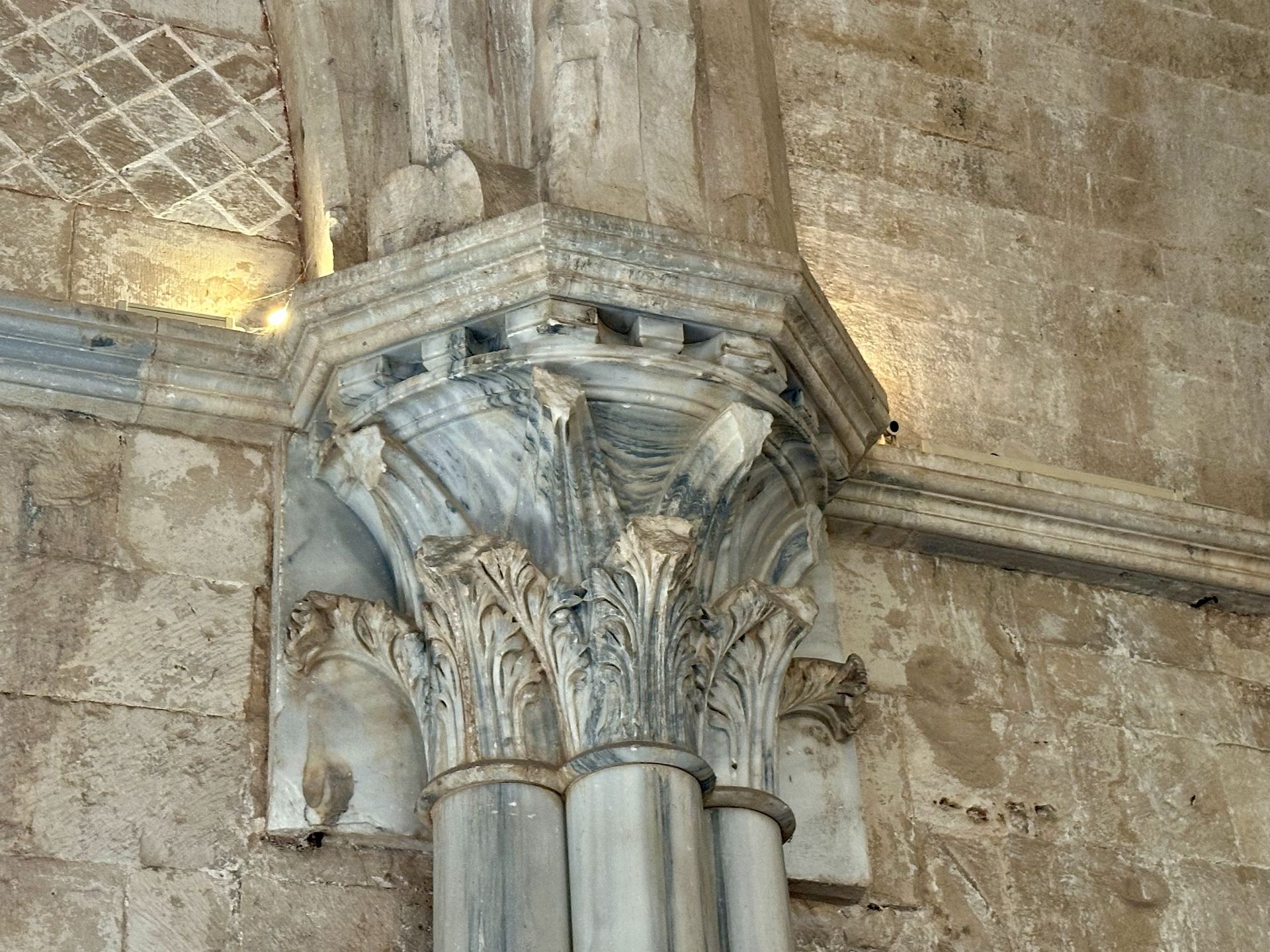 Capitel de mármol sobre un pilar de bulto; también es visible el opus reticulatum (arriba a la izquierda), poco habitual en los edificios medievales y descrito por Vitruvio como una característica de la época augustea. (Foto: Mancini)