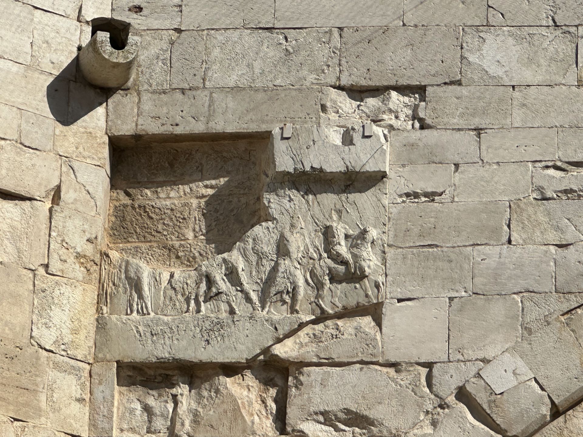 Rilievo in spolia sulla parete nord-est del cortile interno. Molto probabilmente raffigura il trasporto a casa del re Meleagro morto (Foto: Mancini)